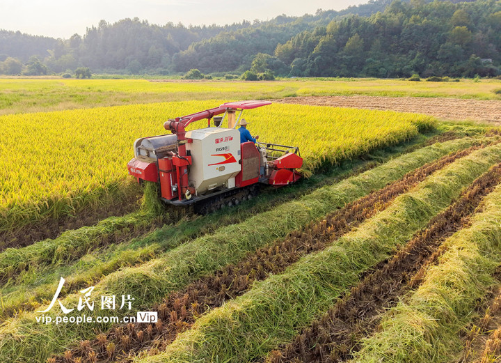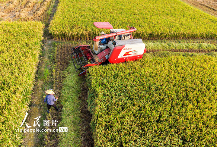 金秋十月,江西省上饶市婺源县中稻进入收获季,农民在田间地头抓紧收割稻谷,一派丰收景象。胡敦煌摄(人民图片网)